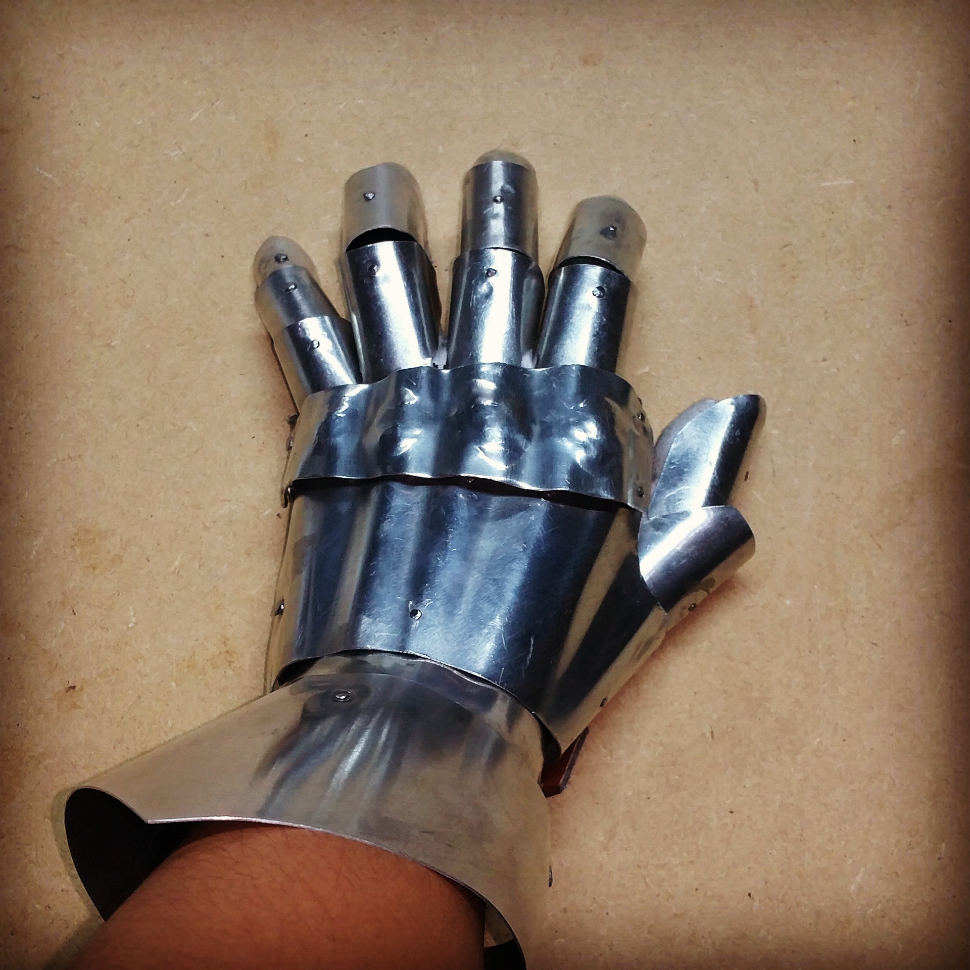 This is a 15th century italian styled gauntlet made for the 2014 AFJROTC Drill Team commander Brayden. It is made with aluminum and polyurethene that is mounted onto a white cotton parade glove.