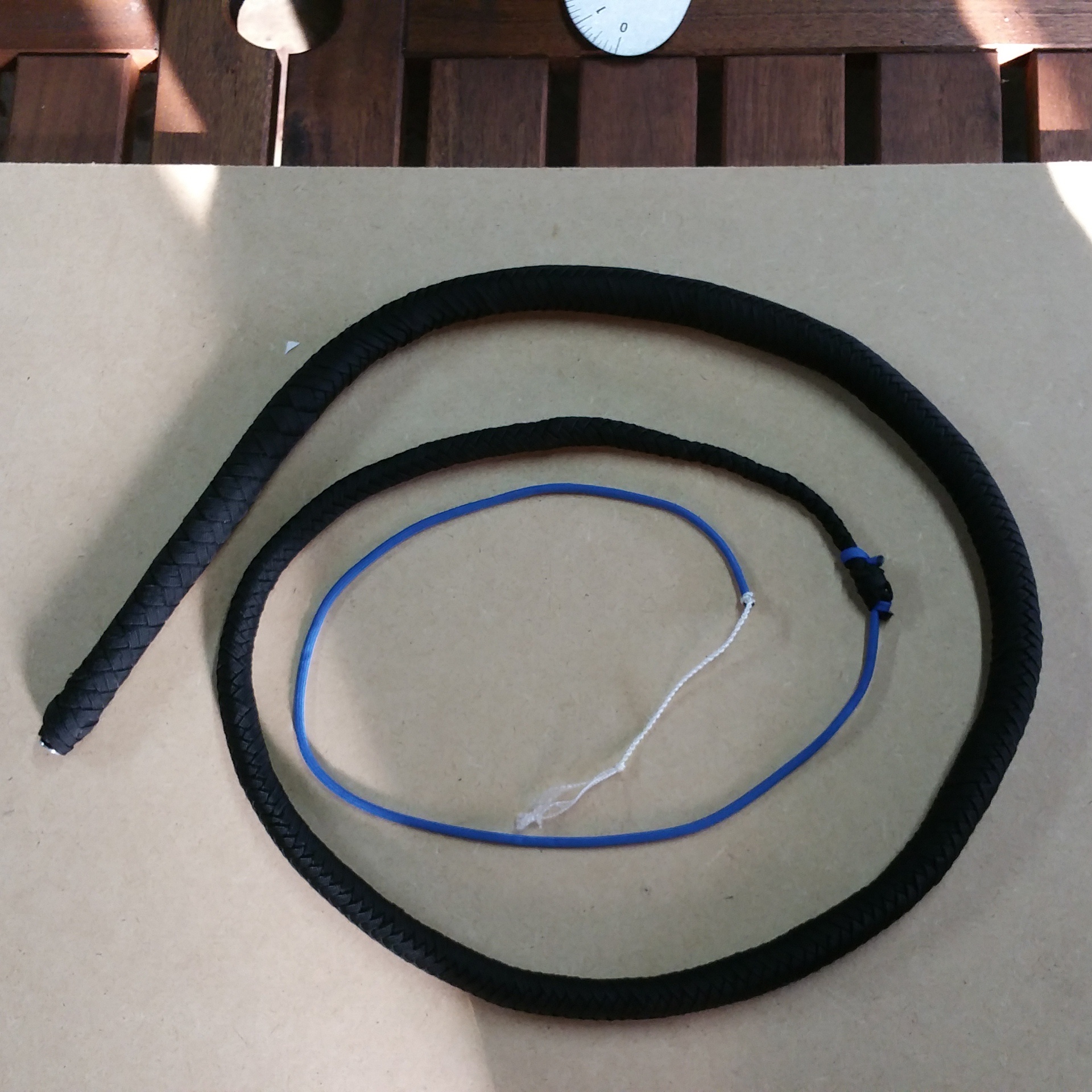 This is a 2 belly bullwhip made with over 100 feet of black and blue paracord, electrical tape, and a 9 inch nail. I built this in one sitting with a total build time of over 12 hours.