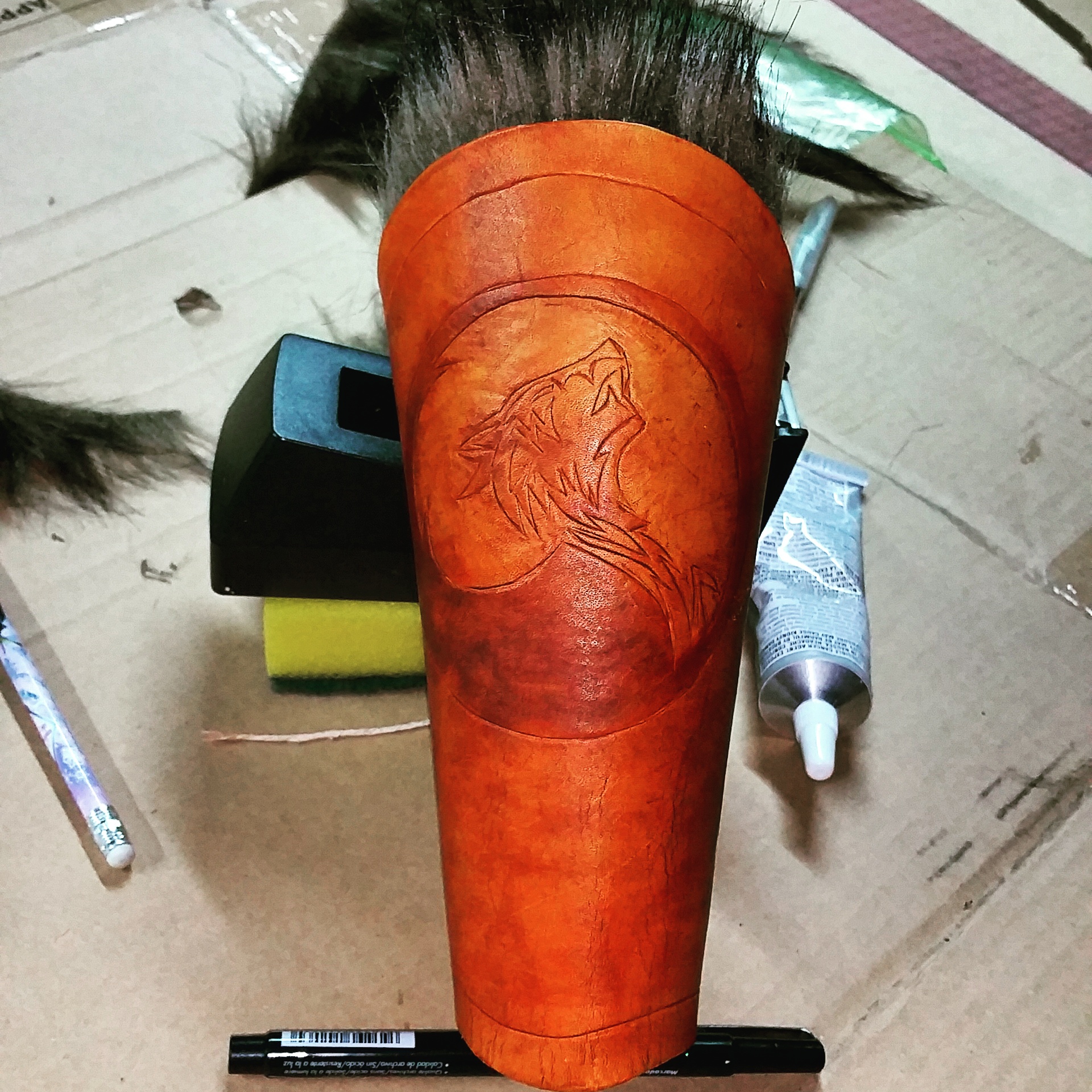 This is a leather gauntlet with a wolf embossed into it. I used 5 ounce leather, saddle tan leather dye, leather grommets, a brown braided leather shoe lace, and a sheet of faux fur.